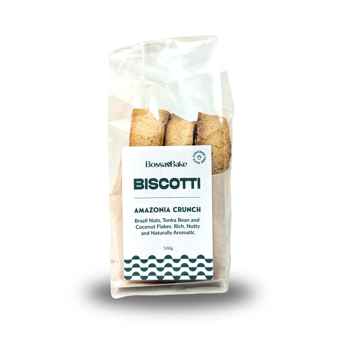Our Amazônia Crunch Biscotti celebrates the heart of tropical baking with a blend of toasted Brazil nuts, coconut, warm spices, and Tonka Bean (Cumaru) — a fragrant seed native to the Amazon rainforest, loved for its naturally sweet, vanilla-caramel aroma. Handcrafted in small batches, each slice delivers a deep, nutty fragrance and a crisp, satisfying texture that makes this one of Bossa & Bake’s most soulful creations.