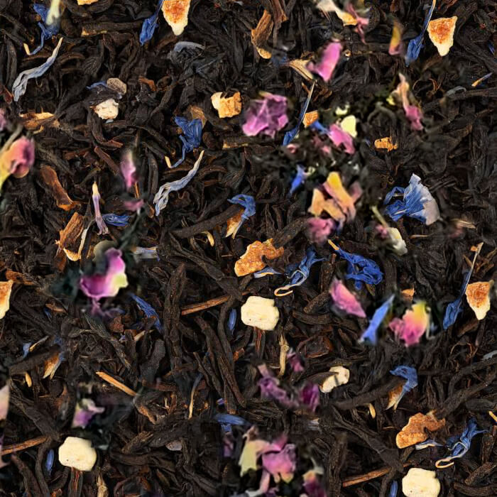 Black tea*, orange peel*, cornflower petals*, rose petals*, natural bergamot and vanilla essences* (*organic)